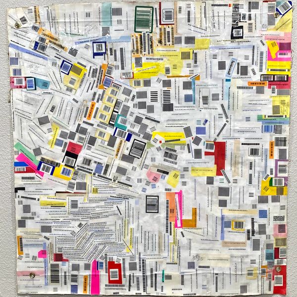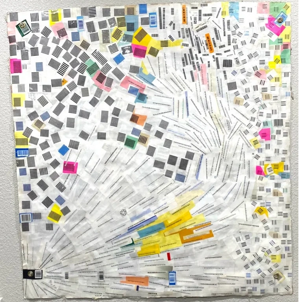 Below are two images of a composition of collected bar codes. "Bar Codes", has a front and a back. This is an eight-in-one piece; meaning it can be hanged eight ways; four on one side and four on the flip side . "Bar Codes" is also a Trashy Fine Art 2.0 and was completed on October 2cd, 2004. It sizes out at 38 3/4" x 41 3/4".