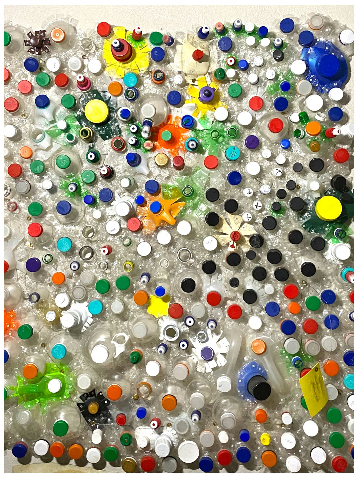 Above is a partial view of the piece, "Plastic Cappings", a Trashy Fine Art 2.0. It is composed of the top portion of plastic containers with their cap. They are riveted and E-6000ed together. The caps are removable. The visual color appearance of the piece can be changed by moving common sized caps around . It wasn't until sixteen years (finished it on June 18th, 2005) after the completion of the piece that I decided to gather as many black caps in close proximity to each other. "Plastic Cappings", is a four-in-one piece; meaning it can be hanged four different ways. "Plastic Cappings", is 48" x 58".